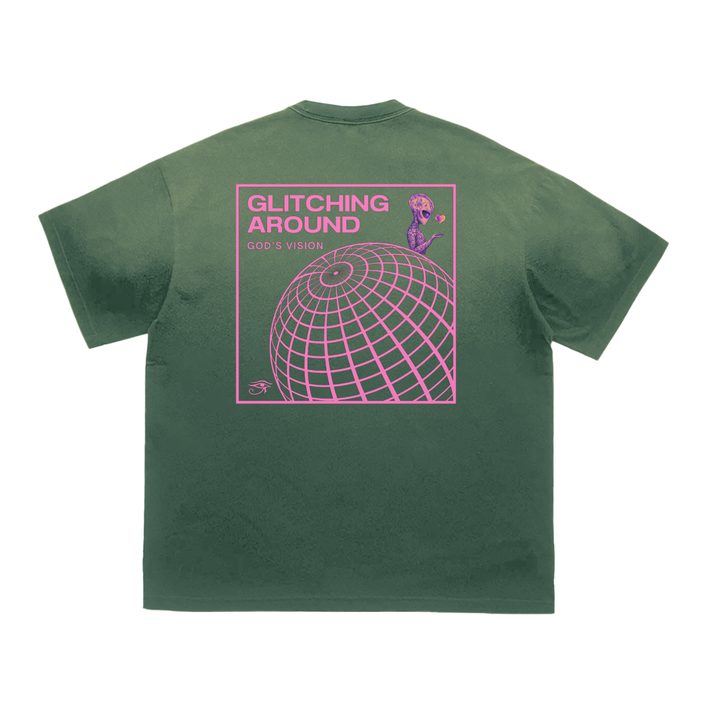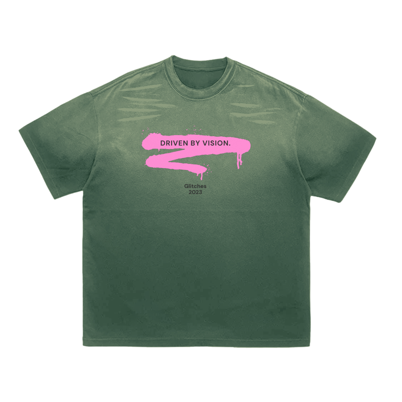 This tee features a bold "Driven By Vision" print in pink on the front with a paint-drip effect, plus a "Glitching Around" graphic on the back for a futuristic vibe. Its worn-in look gives it a streetwear feel that’s hard to miss. Available in cold gray, dark green, and coffee, there’s a shade for every style. Glitches, started in 2023, is all about breaking the mold, and this tee nails that vibe. Pick your size and color, and glitch around today!