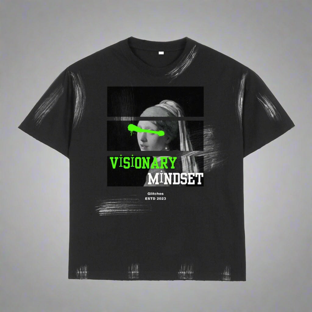 This isn’t just a tee—it’s a challenge to the status quo. The Visionary Mindset T-shirt features a distorted take on Vermeer’s “Girl with a Pearl Earring”, sliced and glitched, her gaze crossed out in neon green. It's not about what you see, it’s about what you choose to believe. With brushstroke distressing and bold typography, this piece represents thinking ahead, breaking loops, and glitching out of the system.
